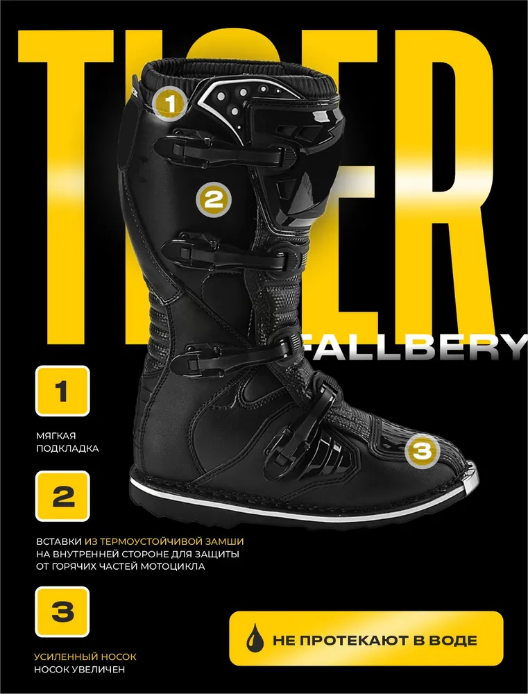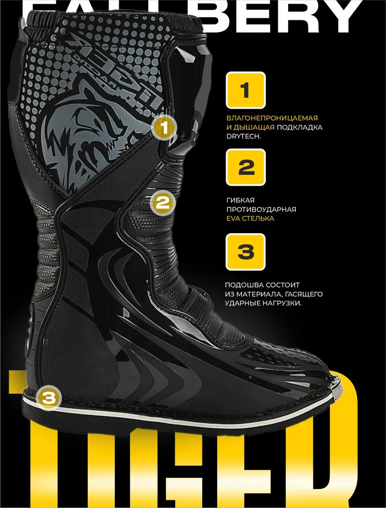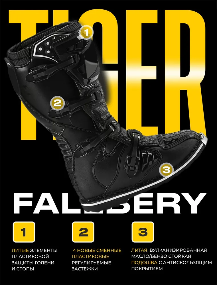 Mотоботы изготовлены из кожи и высококачественного синтетического материала. • Оснащены четырьмя сменными застежками на ремнях, регулируемых по длине,что обеспечивает комфорт и удобство в использовании. • Литая, вулканизированная масло/бензо стойкая подошва имеет антискользящее покрытие. • Литые элементы пластиковой защиты голени и стопы. • Усиленный носок. • Вставки из термоустойчивой замши на внутренней стороне для защиты от горячих частей мотоцикла. • Мягкая подкладка. • Эргономичный дизайн, гофрированные вставки на изгибах. • Застежка на липучке вокруг голени. • Подошва состоит из материала, гасящего ударные нагрузки. • Гибкая противоударная EVA стелька • Влагонепроницаемая и дышащая подкладка DryTech.