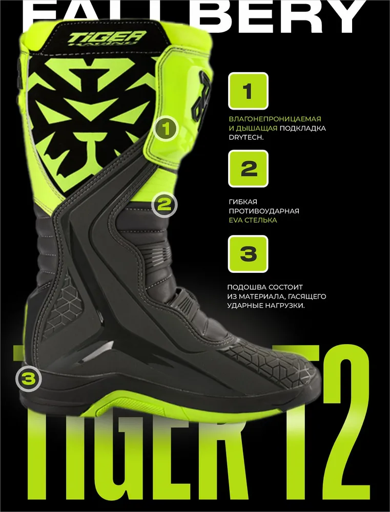 Mотоботы изготовлены из кожи и высококачественного синтетического материала. • Оснащены четырьмя сменными застежками на ремнях, регулируемых по длине,что обеспечивает комфорт и удобство в использовании. • Литая, вулканизированная масло/бензо стойкая подошва имеет антискользящее покрытие. • Литые элементы пластиковой защиты голени и стопы. • Усиленный носок. • Вставки из термоустойчивой замши на внутренней стороне для защиты от горячих частей мотоцикла. • Мягкая подкладка. • Эргономичный дизайн, гофрированные вставки на изгибах. • Застежка на липучке вокруг голени. • Подошва состоит из материала, гасящего ударные нагрузки. • Гибкая противоударная EVA стелька • Влагонепроницаемая и дышащая подкладка DryTech.