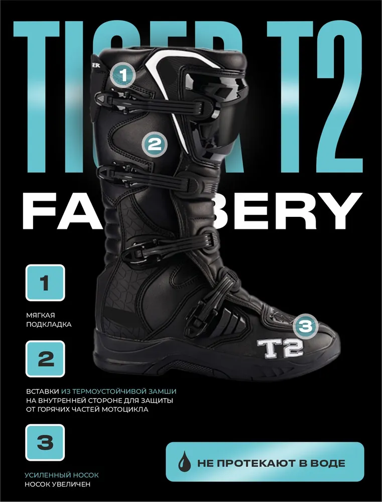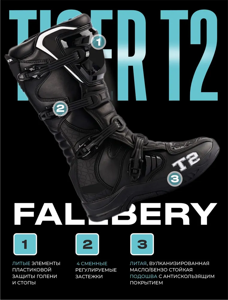 Mотоботы изготовлены из кожи и высококачественного синтетического материала. • Оснащены четырьмя сменными застежками на ремнях, регулируемых по длине,что обеспечивает комфорт и удобство в использовании. • Литая, вулканизированная масло/бензо стойкая подошва имеет антискользящее покрытие. • Литые элементы пластиковой защиты голени и стопы. • Усиленный носок. • Вставки из термоустойчивой замши на внутренней стороне для защиты от горячих частей мотоцикла. • Мягкая подкладка. • Эргономичный дизайн, гофрированные вставки на изгибах. • Застежка на липучке вокруг голени. • Подошва состоит из материала, гасящего ударные нагрузки. • Гибкая противоударная EVA стелька • Влагонепроницаемая и дышащая подкладка DryTech.