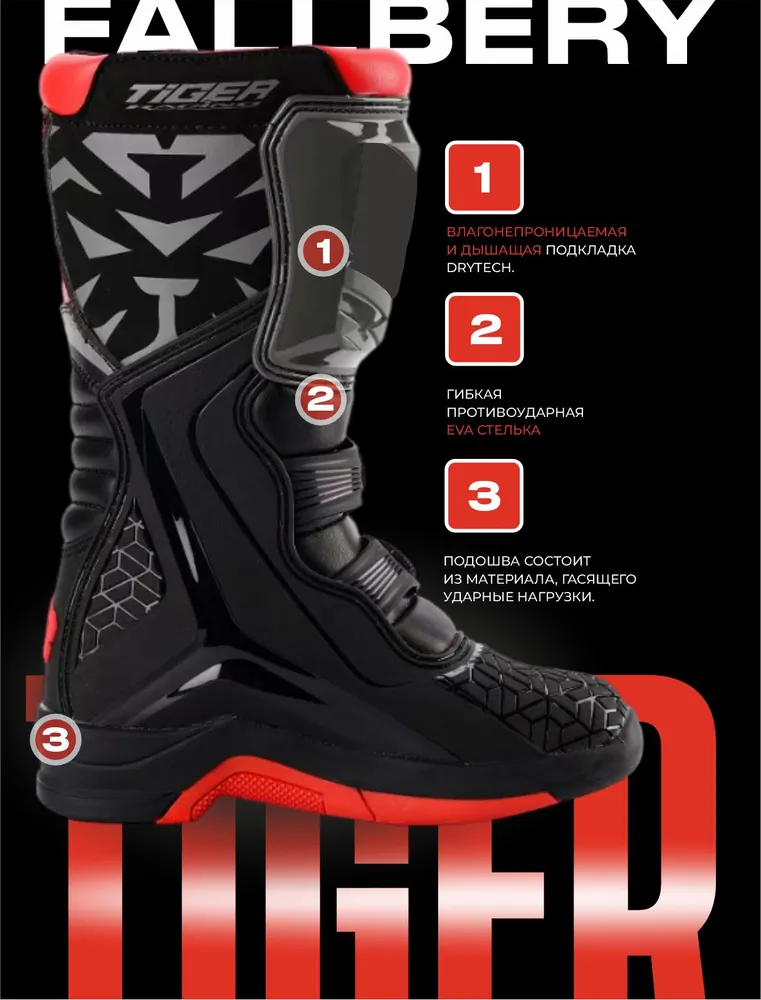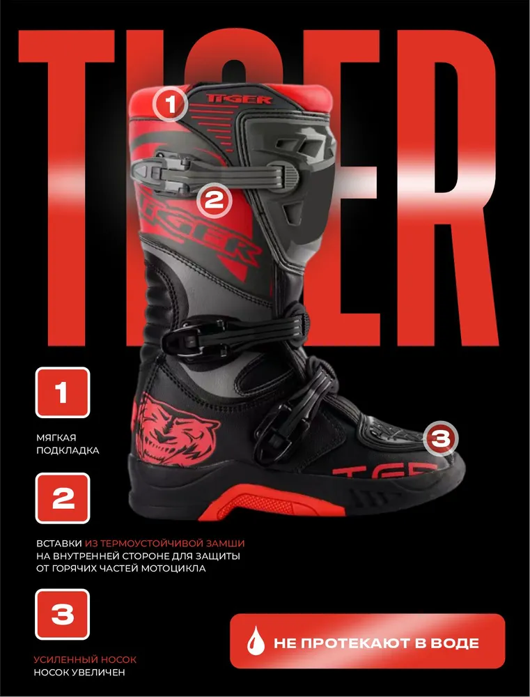 Детские мотоботы TIGER из высококачественной кожи, комбинированной с синтетическим материалом, обеспечат непревзойденный комфорт и эффективную защиту для подрастающего мотогонщика. Они одинаково хорошо обезопасят голени, ступни и пятки при экстремальных условиях эндуро или мотокроссов, так как оснащены прочными пластиковыми элементами и усиленным носком. Эргономичный и выразительный дизайн дополняет удобная вентилируемая внутренняя подкладка, которая также устраняет потливость.