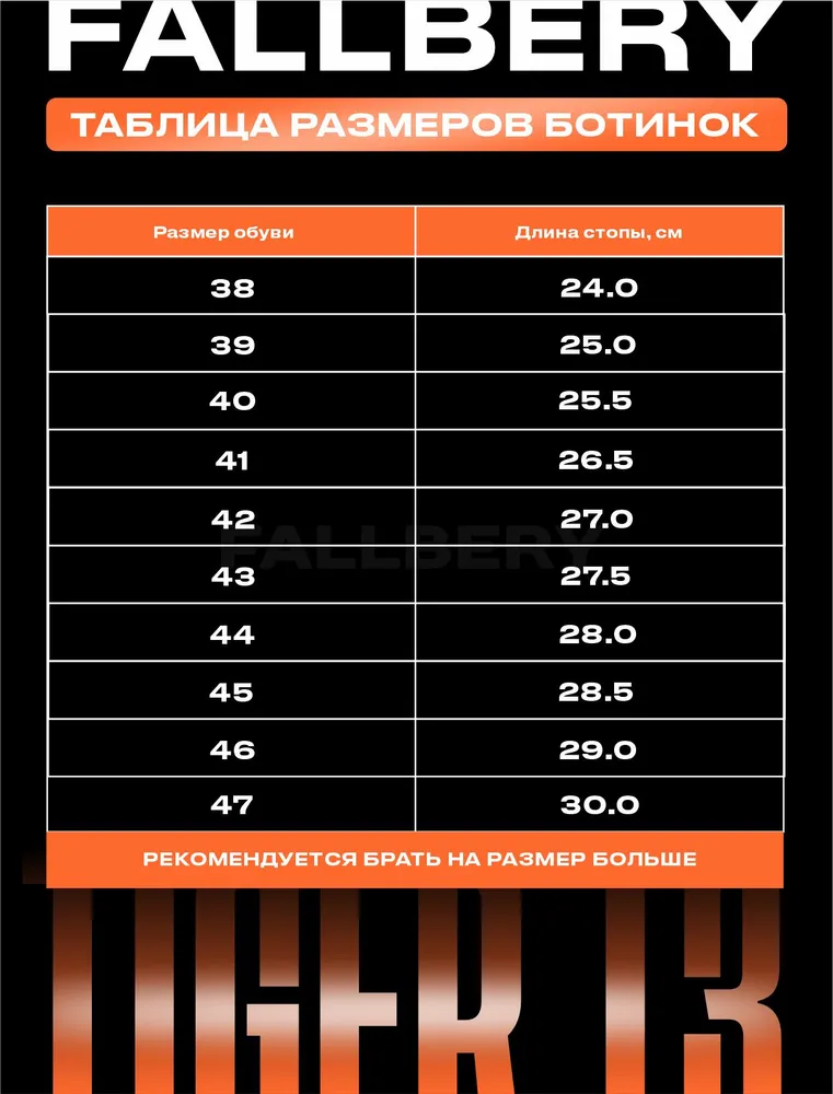 Модель имеет склонность к маломерке. Чтобы боты сидели идеально и не давили, рекомендуем заказывать на 1 размер больше вашего привычного гражданского размера (например, если вы носите 44, выбирайте 45). Подробная таблица размеров представлена в фотогалерее.