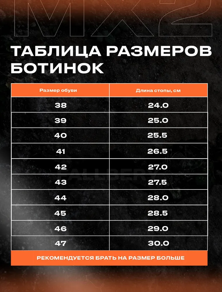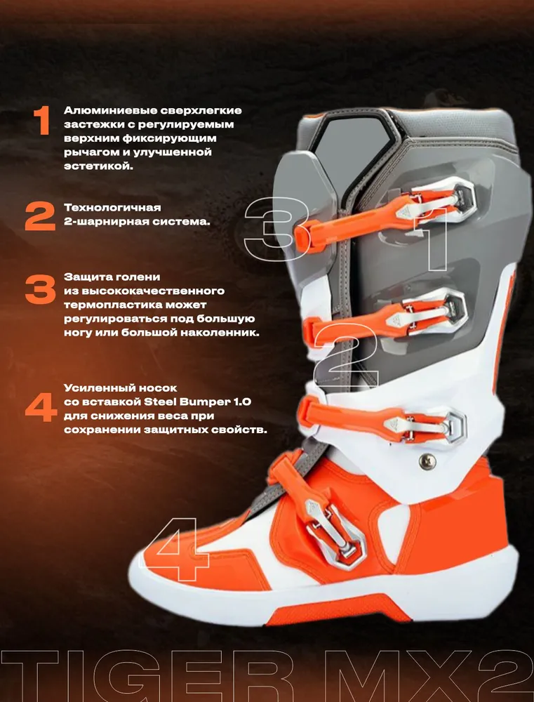 С гордостью заявляет, что крупнейшие мировые издания проведя с мотоботами MX2 ряд суровых испытаний, выпустили рецензии с оценкой пять звезд, утверждая, что это самые прочные, удобные и защищенные мотоботы на сегодняшний день.Обновленные MX2, в первую очередь, можно узнать по новой стилизованной букве "MX2" - символу "лучшего ботинка для мотокросса".