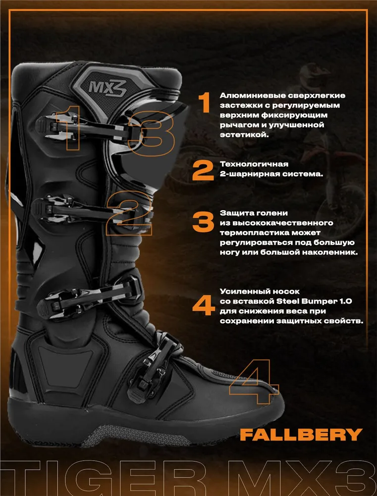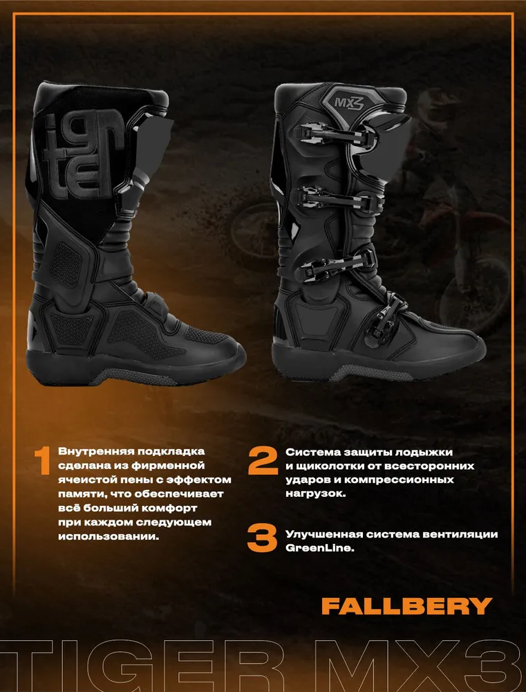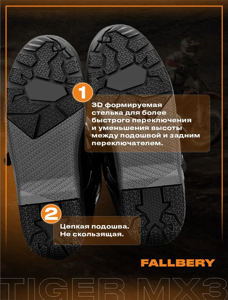 Мотоботы FALLBERY TIGER MX3: максимальная защита и комфорт Современные мотоботы TIGER MX3 оснащены уникальной системой с двумя шарнирами, что обеспечивает надежную фиксацию и свободу движения. Передняя пластина изготовлена из прочного термопластика для защиты голени. Улучшенная геометрия конструкции облегчает каждое движение и делает катание более безопасным даже в сложных условиях. Эргономичная подошва и надежное сцепление 3D формируемая стелька облегчает быстрые переключения и уменьшает высоту между подошвой и задним переключателем, повышая управляемость. Специальный рисунок и материал подошвы гарантируют отличное сцепление с поверхностью и предотвращают скольжение в любых условиях. Ключевые технологии мотобот TIGER MX3 Мотоботы TIGER MX3 оснащены сверхлегкими алюминиевыми застежками с регулируемым фиксирующим рычагом для надежной посадки и эстетики. В конструкции применяется инновационная двухшарнирная система для повышенной гибкости и комфорта. Защиту голени обеспечивает пластина из премиального термопластика с возможностью регулировки под индивидуальные параметры. Усиленный носок со вставкой Steel Bumper 1.0 снижает общий вес, сохраняя необходимые защитные свойства. Защита и контроль на каждом участке стопы TIGER MX3 оснащены усовершенствованной двухступенчатой шарнирной системой для максимальной защиты голеностопа, а также дополнительными пластинами для прочности. Пяточный сустав и верх стопы надежно защищены, область контакта с лапкой переключения сделана из современного пластика для лучшего контроля. Внутренняя резиновая вставка Grip Guard 1.0 обеспечивает уверенное сцепление с мотоциклом, а теплонепроницаемая подкладка и комплексная защита от голени до стопы гарантируют комфорт и безопасность на всем пути. Комфорт на каждом этапе движения Специальная внутренняя подкладка с ячеистой пеной и эффектом памяти обеспечивает максимальный комфорт при каждом повторном использовании. Мотоботы TIGER MX3 защищают лодыжку и щиколотку от всесторонних ударов и компрессионных нагрузок. Система вентиляции GreenLine улучшает воздушный обмен, сохраняя свежесть внутри обуви. Таблица размеров мотобот TIGER MX3 Чтобы выбрать подходящий размер мотобот, измерьте длину стопы по инструкции на изображении и сверьте результат с таблицей. Для удобства и свободы движений рекомендуется брать обувь на размер больше. Диапазон размеров — с 38 по 47, пошагово указанная длина стопы в сантиметрах.