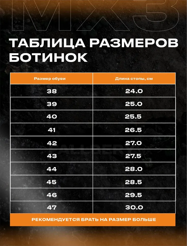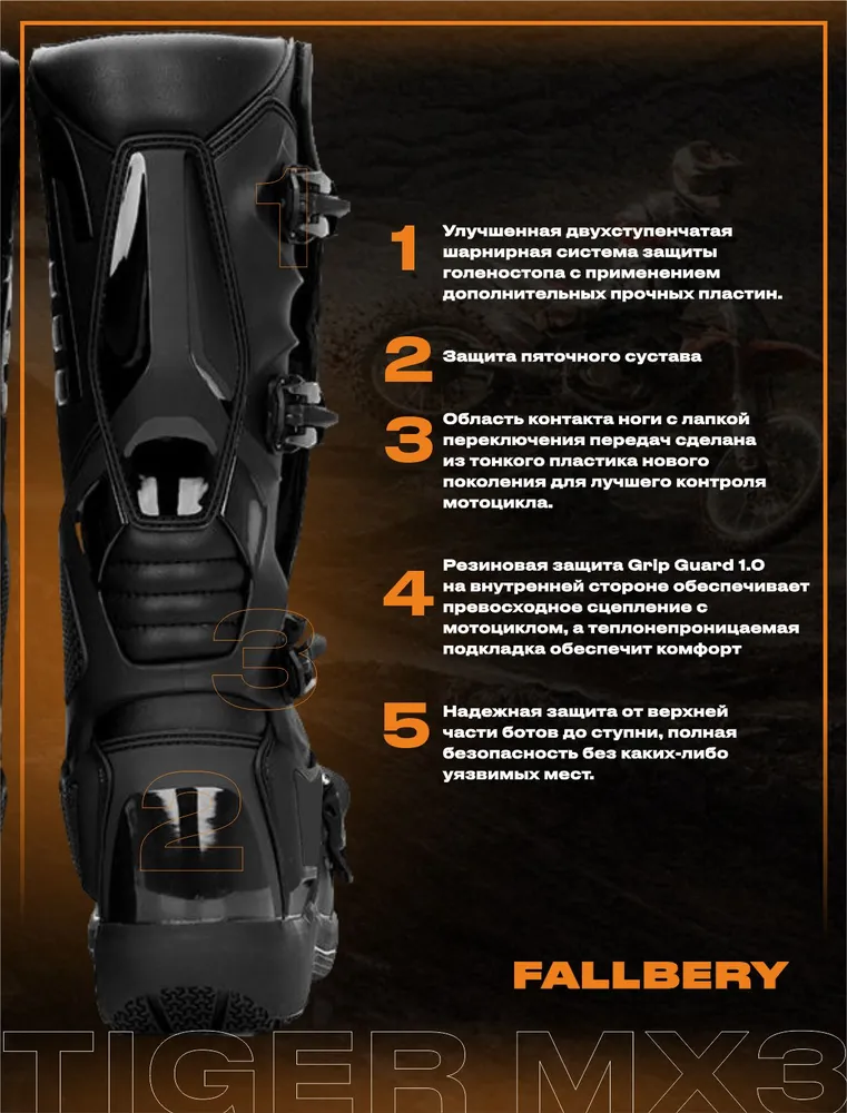 Мотоботы FALLBERY TIGER MX3: максимальная защита и комфорт Современные мотоботы TIGER MX3 оснащены уникальной системой с двумя шарнирами, что обеспечивает надежную фиксацию и свободу движения. Передняя пластина изготовлена из прочного термопластика для защиты голени. Улучшенная геометрия конструкции облегчает каждое движение и делает катание более безопасным даже в сложных условиях. Эргономичная подошва и надежное сцепление 3D формируемая стелька облегчает быстрые переключения и уменьшает высоту между подошвой и задним переключателем, повышая управляемость. Специальный рисунок и материал подошвы гарантируют отличное сцепление с поверхностью и предотвращают скольжение в любых условиях. Ключевые технологии мотобот TIGER MX3 Мотоботы TIGER MX3 оснащены сверхлегкими алюминиевыми застежками с регулируемым фиксирующим рычагом для надежной посадки и эстетики. В конструкции применяется инновационная двухшарнирная система для повышенной гибкости и комфорта. Защиту голени обеспечивает пластина из премиального термопластика с возможностью регулировки под индивидуальные параметры. Усиленный носок со вставкой Steel Bumper 1.0 снижает общий вес, сохраняя необходимые защитные свойства. Защита и контроль на каждом участке стопы TIGER MX3 оснащены усовершенствованной двухступенчатой шарнирной системой для максимальной защиты голеностопа, а также дополнительными пластинами для прочности. Пяточный сустав и верх стопы надежно защищены, область контакта с лапкой переключения сделана из современного пластика для лучшего контроля. Внутренняя резиновая вставка Grip Guard 1.0 обеспечивает уверенное сцепление с мотоциклом, а теплонепроницаемая подкладка и комплексная защита от голени до стопы гарантируют комфорт и безопасность на всем пути. Комфорт на каждом этапе движения Специальная внутренняя подкладка с ячеистой пеной и эффектом памяти обеспечивает максимальный комфорт при каждом повторном использовании. Мотоботы TIGER MX3 защищают лодыжку и щиколотку от всесторонних ударов и компрессионных нагрузок. Система вентиляции GreenLine улучшает воздушный обмен, сохраняя свежесть внутри обуви. Таблица размеров мотобот TIGER MX3 Чтобы выбрать подходящий размер мотобот, измерьте длину стопы по инструкции на изображении и сверьте результат с таблицей. Для удобства и свободы движений рекомендуется брать обувь на размер больше. Диапазон размеров — с 38 по 47, пошагово указанная длина стопы в сантиметрах.